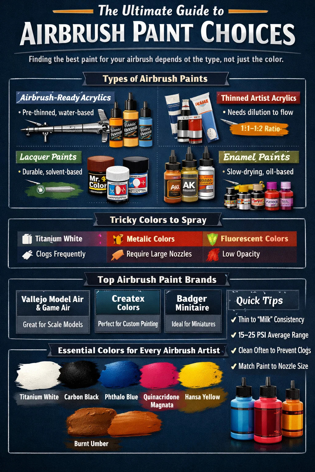 最良のエアブラシ カラーは、セットアップ内をきれいに流れ、表面に密着し、望んでいる効果を実現するカラーです。 — そしてその答えはアーティストごと、プロジェクトごと、そしてエアブラシごとに異なります。顔料のサイズ、粘度、塗料の化学的性質の背後にある原理を理解すると、いつでも自信を持って判断できるようになります。