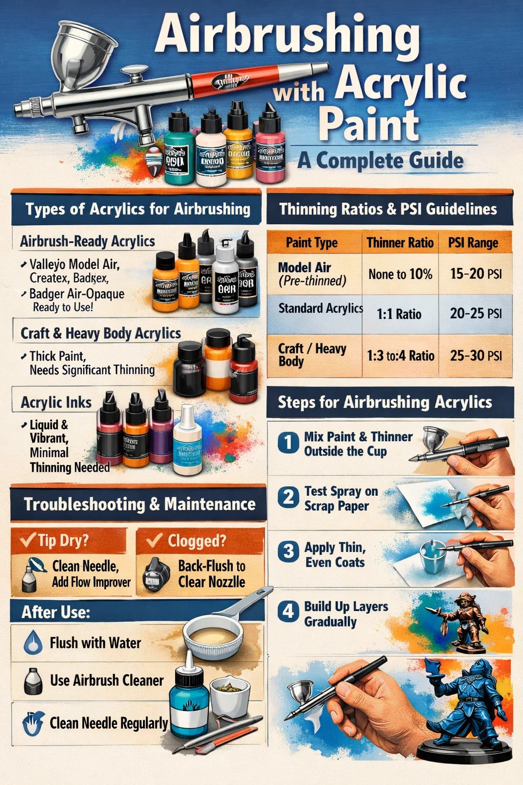 適切なペイントを使用したとしても、技術的なハードルに遭遇する可能性があります。これらを解決するには、エアブラシ、空気圧、アクリルメディウムの関係を理解する必要があります。