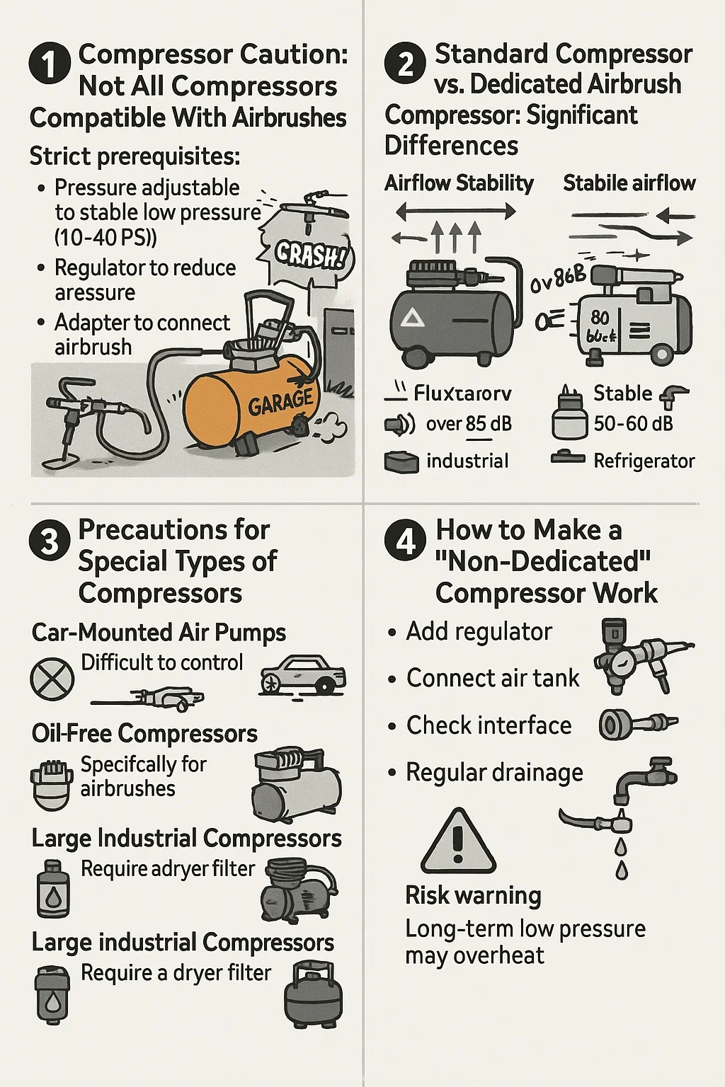 • 運用コスト: 標準コンプレッサーを改造するには付属品 (アジャスター コネクタ) を購入する必要があり、合計価格はエントリーレベルのエアブラシ コンプレッサー (基本的な Sparmax モデルなど) の価格を超える場合があります。